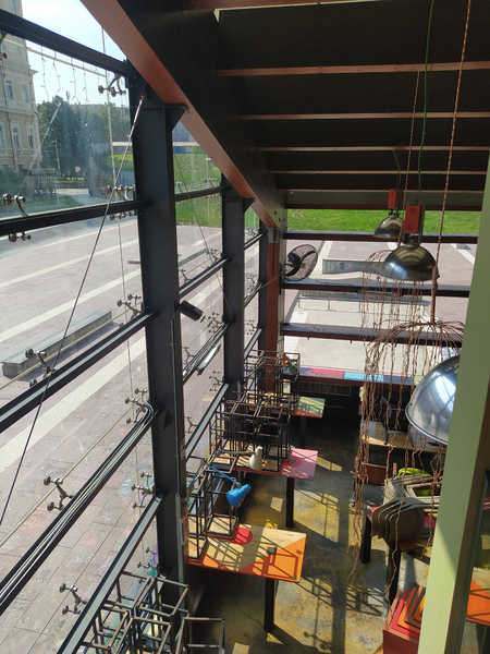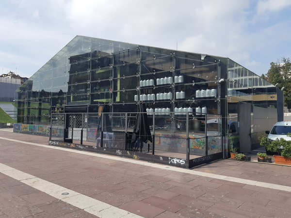 La stessa è nata essenzialmente al fine di creare un ingresso pedonale al parcheggio interrato del piazzale, con annessi uffici di controllo, casse, servizi igienici e sala polivalente. A tale scopo è stata creata una struttura in legno lamellare a tre cerniere con la forma di una casa stereotipata, tamponata da una vetrata con pannelli giuntati “a ragnetto” ed un sistema di brise-soleil sui lati. Tre delle quattro facciate sono completamente vetrate, ad eccezione di quella su via San Francesco da Paola (ingresso ai parcheggi), che è rivestita con piastrelloni litici.
