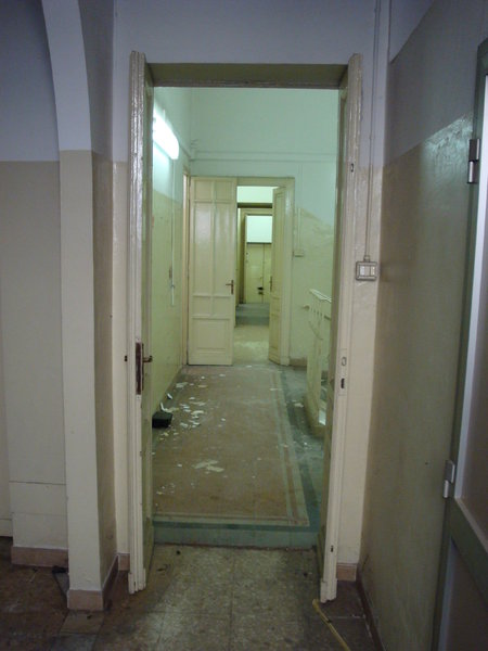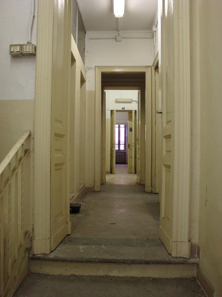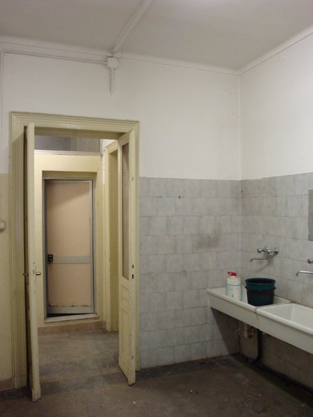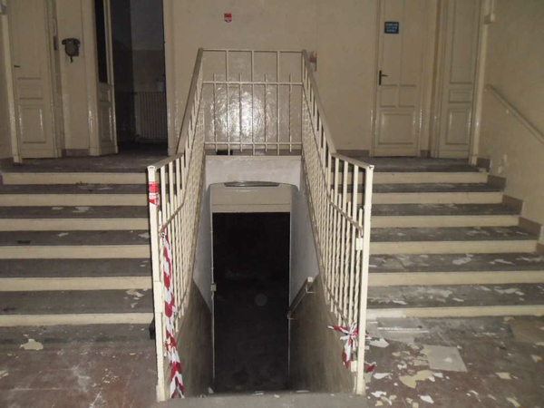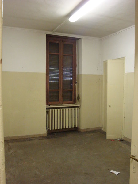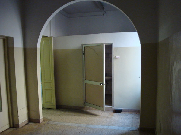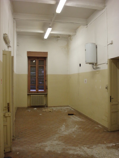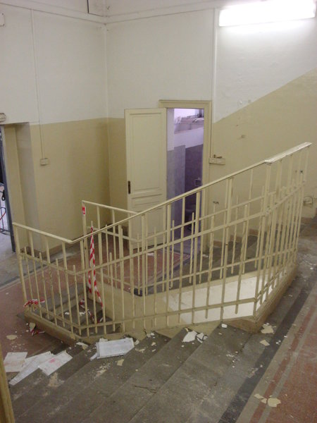 La scala interna a due rampe funge da disimpegno centrale tra quelle che erano le funzioni originarie: da una parte, verso strada, si aprono i locali accessori dedicati all’attività di lavatoio pubblico a suo tempo ospitata presso lo stabile, mentre dall’altra, verso il cortile interno, si presenta il grande magazzino che un tempo ospitava le vasche del lavatoio.