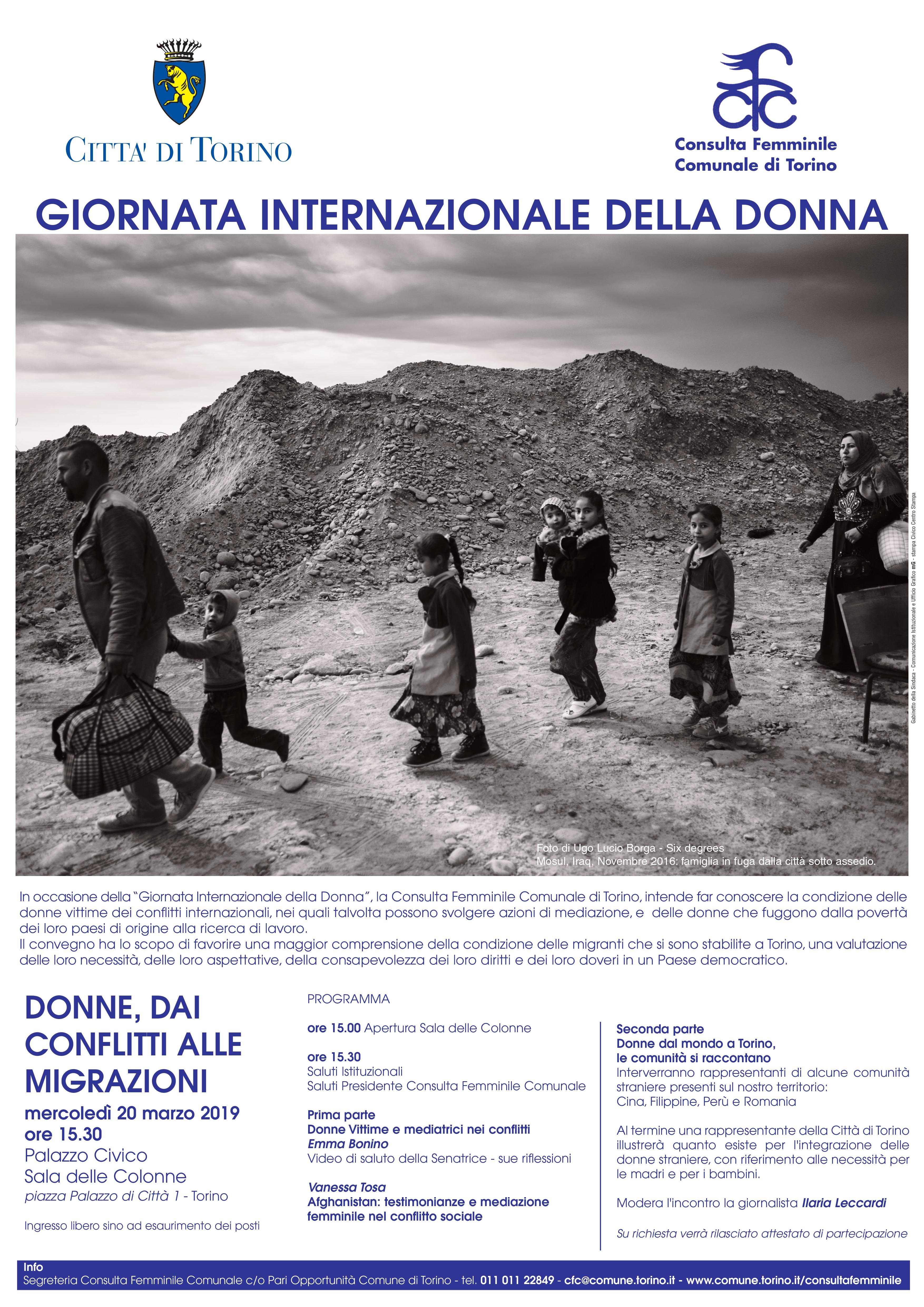 In occasione della "Giornata Internazionale della Donna", la Consulta Femminile Comunale di Torino organizza il convegno "Donne, dai conflitti alle migrazioni". L'iniziativa avrá luogo nella Sala delle Colonne di Palazzo Civico, Piazza Palazzo di Cittá 1, mercoledí 20 marzo alle ore 15.30. Si intende far conoscere la condizione delle donne vittime dei conflitti internazionali, nei quali talvolta possono svolgere azioni di mediazione, e delle donne che fuggono dalla povertá dei loro paesi di origine alla ricerca di lavoro.