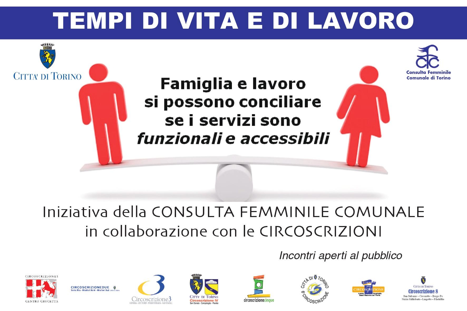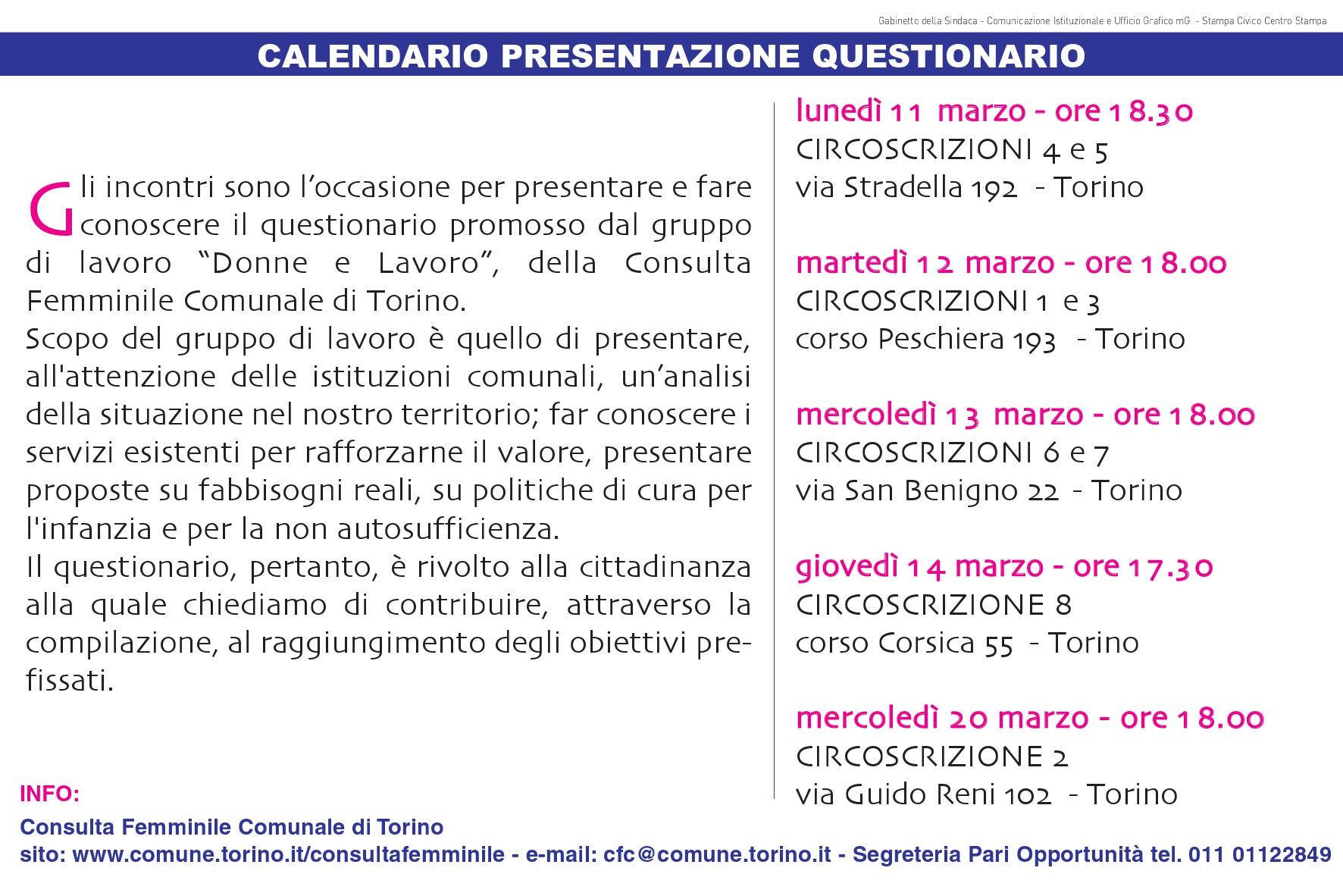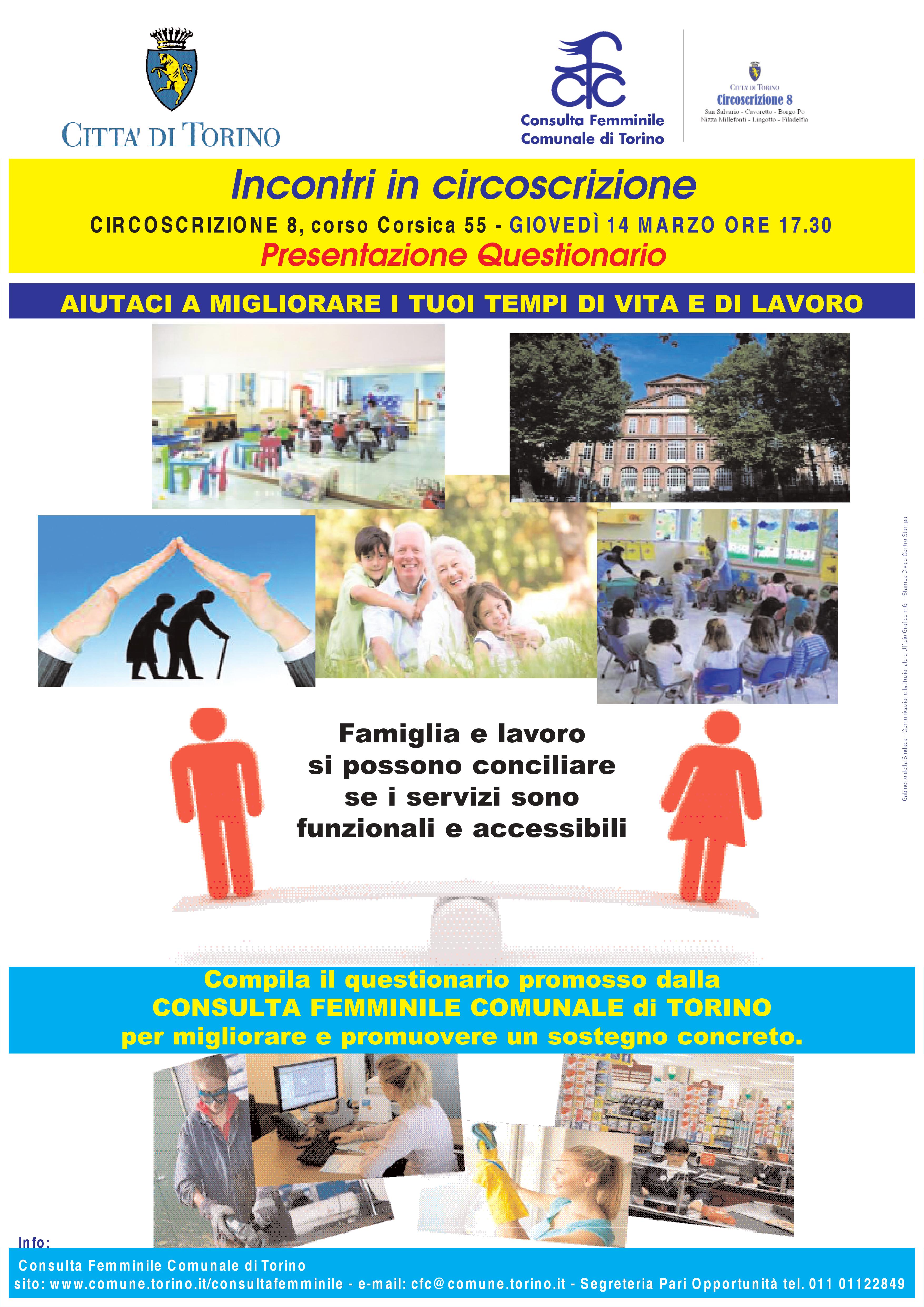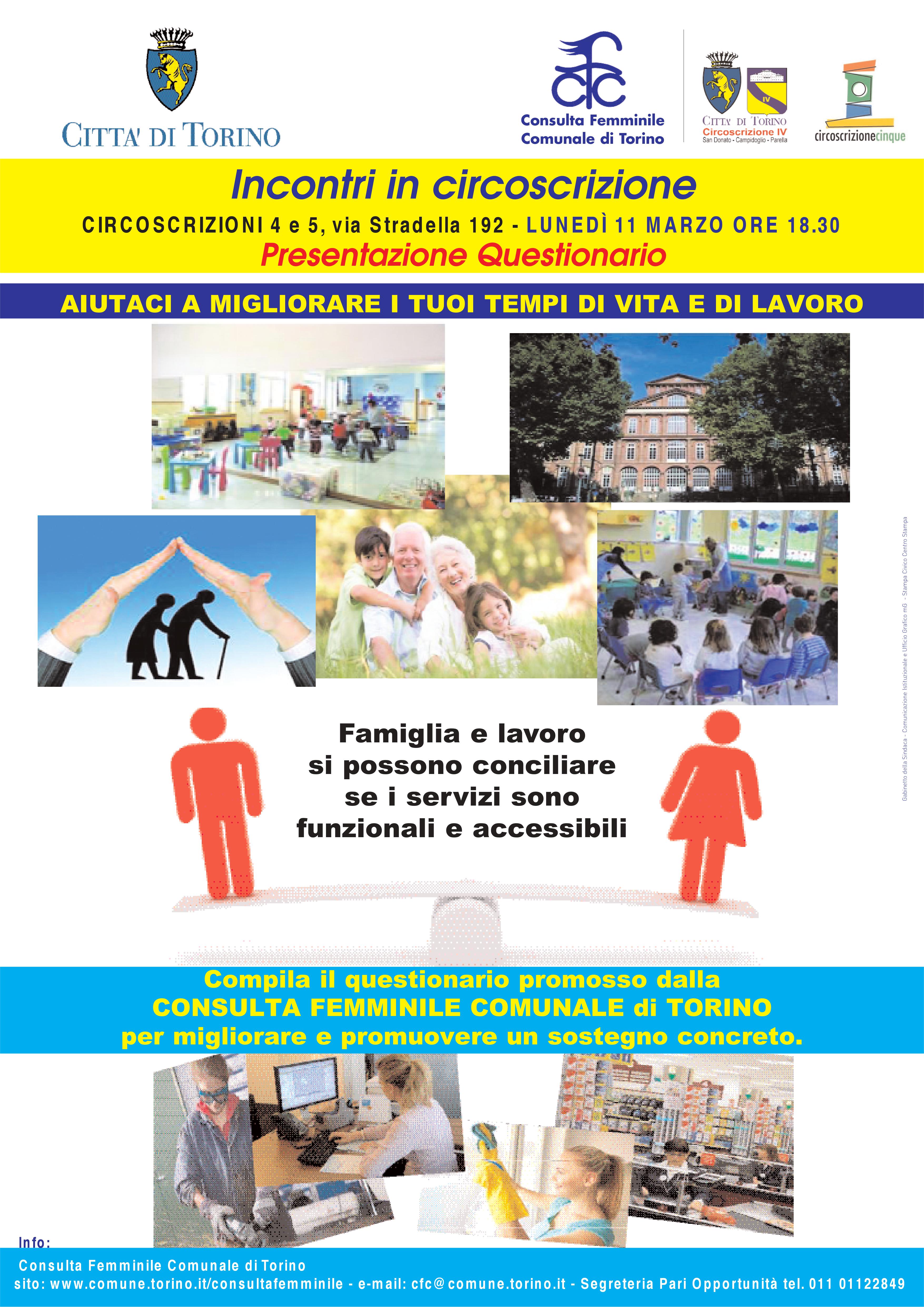 Gli incontri che si svolgeranno nel mese di marzo sono l'occasione per presentare e fare conoscere il questionario promosso dal gruppo di lavoro "Donne e Lavoro", della Consulta Femminile Comunale di Torino. Obiettivo è quello di presentare alle istituzioni comunali, attraverso una analisi dei risultati che emergeranno dai questionari compilati dai cittadini, proposte su fabbisogni reali, politiche di cura per l'infanzia e per la non autosufficienza.