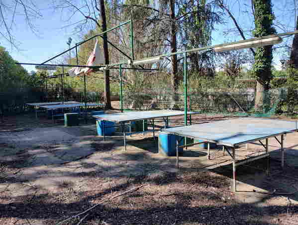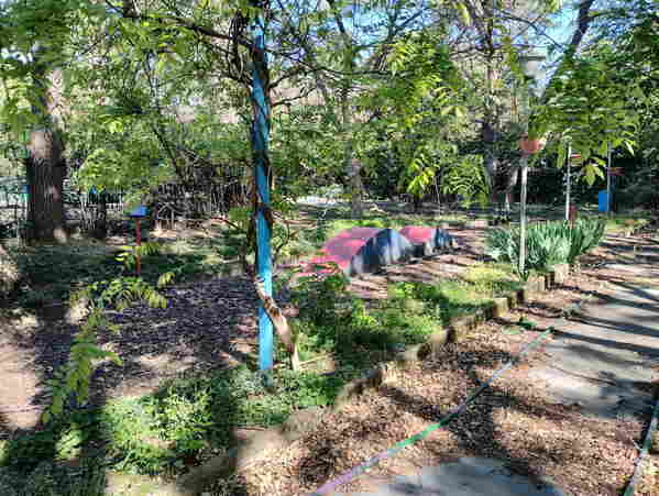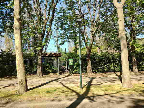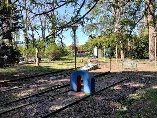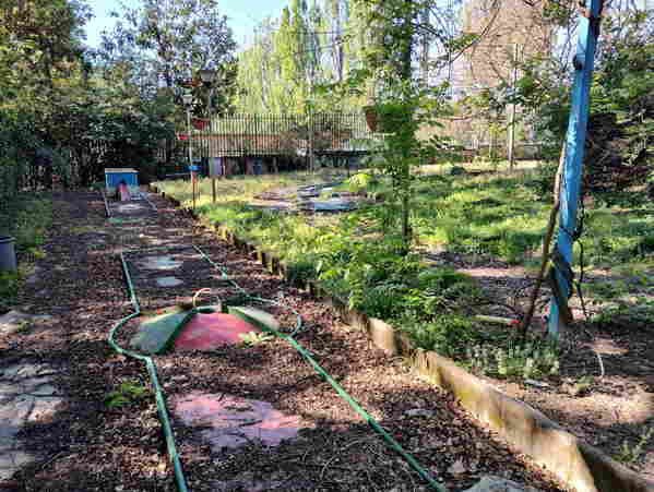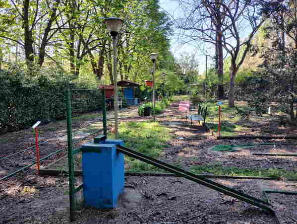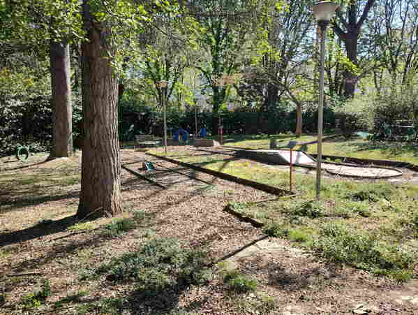 Porzione di area a verde attrezzata per il gioco del minigolf e del ping pong, ricca di siepi e di alberi ad alto fusto con accesso pedonale lungo il viale alberato del parco Ruffini.