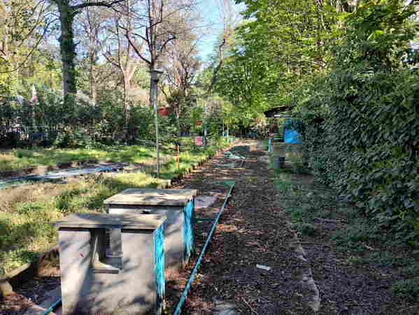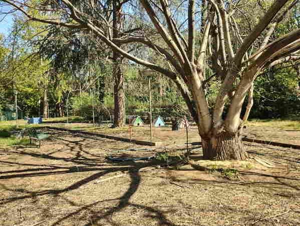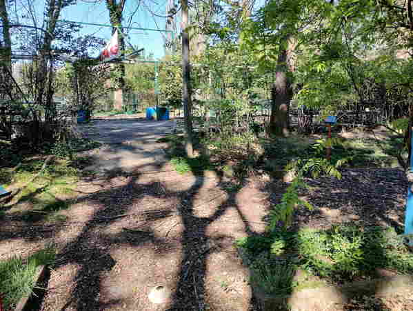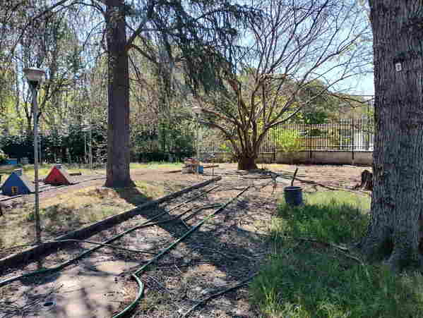 Il cancello di accesso è pedonale ed è posto lungo il viale alberato del parco Ruffini verso corso Trapani; il perimetro dell’area è interamente delimitato da recinzione metallica. Completa l’area attrezzata un bagno prefabbricato, una tettoia in legno con sottostante bancone ed un armadio in ferro.