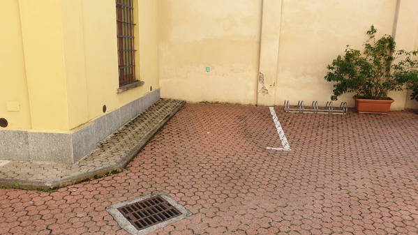 Il cortile, così come i posti auto ivi presenti, è pavimentato in blocchetti in calcestruzzo esagonali.