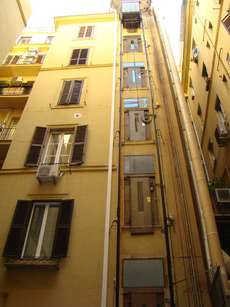 La scala, dotata di pavimento in marmo (al pari degli androni), è servita da ascensore, fruibile esclusivamente a partire dal pianerottolo ubicato tra il piano terra ed il piano primo. Tale manufatto non consente tuttavia gli sbarchi ai singoli piani, ma solamente a pianerottoli intermedi, dai quali, percorrendo una singola rampa di scale, è possibile raggiungere i pianerottoli sui quali si affacciano i vari alloggi. L’ascensore è stato realizzato, infatti, successivamente rispetto al complesso immobiliare, fruendo di una porzione del cortile condominiale, nel quale è stata ricavata la relativa colonna.