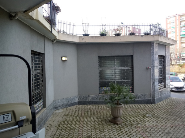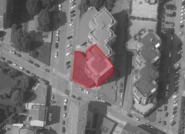 Il complesso edilizio di cui l’unità fa parte è stato realizzato nei primi anni ‘70: si compone di tre edifici sostanzialmente simili di sei piani fuori terra, a destinazione residenziale, che si ergono da un piano terreno di maggiore sagoma, costituito da negozi e uffici, e da una piastra interrata con cantine, autorimesse e spazi correlati alle attività del sovrastante piano terreno.