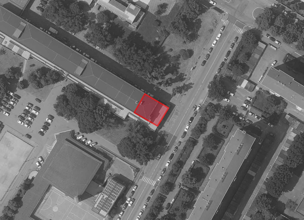 L’immobile è collocato al piano terreno in via Negarville 8 interno 10 ed è parte di un complesso commerciale-servizi a tre piani fuori terra realizzato negli anni settanta del Novecento. Il compendio immobiliare, realizzato in elementi prefabbricati in cemento armato con copertura piana, usufruisce di un’ampia area a parcheggio libero.
